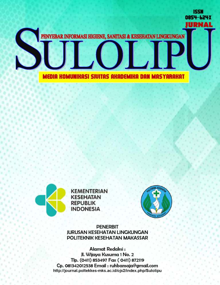 Sulolipu : Media Komunikasi sivitas Akademika dan masyarakat merupakan jurnal ilmiah berkala yang diterbitkan oleh Politeknik Kesehatan Kemenkes Makassar Jurusan Kesehatan Lingkungan dengan pISSN : 0854-624X ( Cetak ), dan e-ISSN : 2622-6960 ( Online )