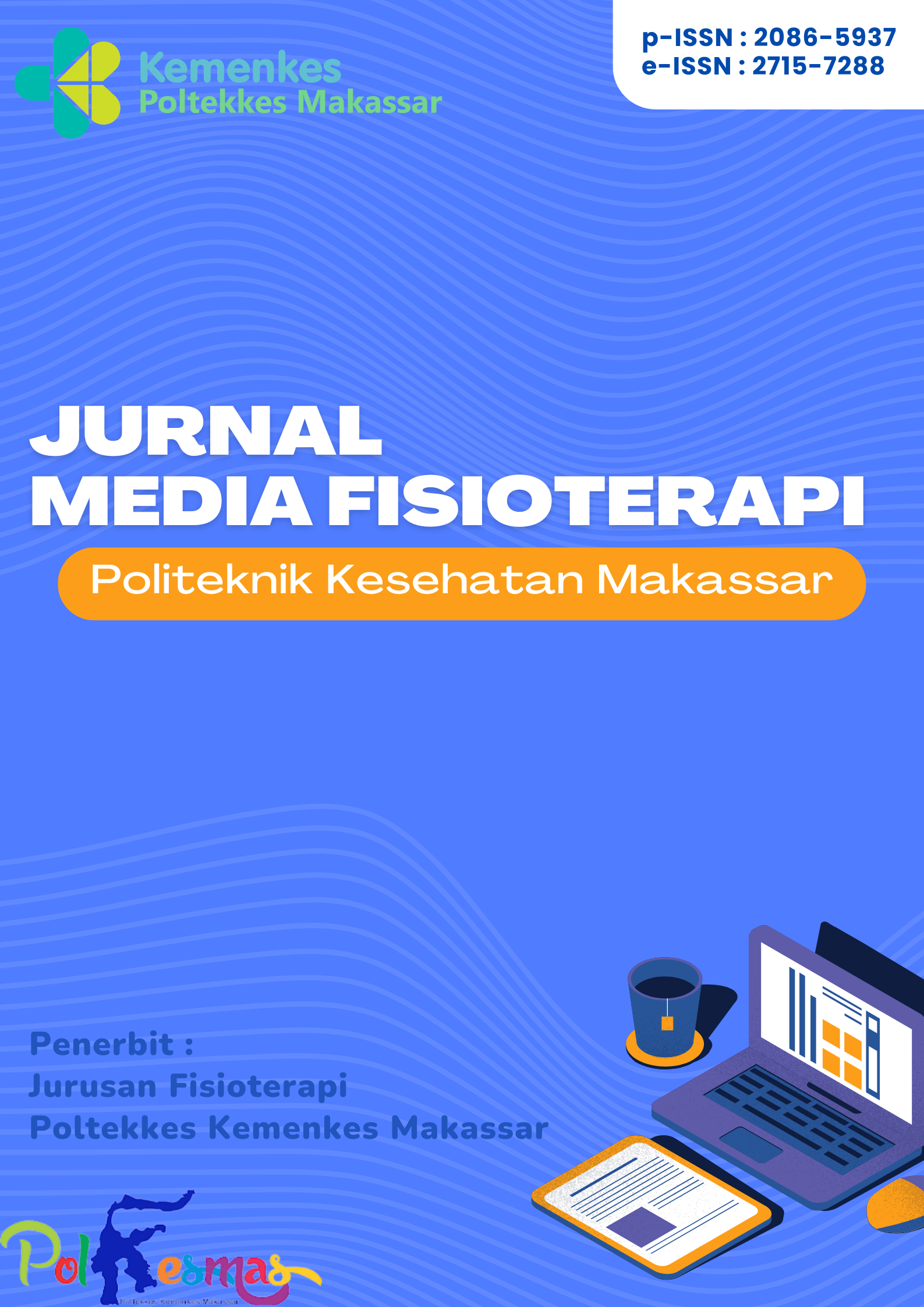 Jurnal Media Fisioterapi Poltekkes Kemenkes Makassar adalah jurnal ilmiah yang dipublikasi oleh Unit Penelitian Poltekkes Kemenkes Makassar Jurusan Fisioterapi. Jurnal Media Fisioterapi merupakan Jurnal Nasional yang diterbitkan dalam Bahasa Indonesia dan telah teregister dengan p-ISSN: 2086-5937 dan e-ISSN : 2715-7288. Jurnal ini merupakan mutasi dari OJS2 Media Fisioterapi Poltekkes Kemenkes Makassar. Jurnal Media Fisioterapi Poltekkes Kemenkes Makassar fokus pada hasil-hasil penelitian asli dan terbaru, book review dan literatur review dalam lingkup ilmu fisioterapi mencakup ilmu Fisioterapi Muskuloskeletal, Fisioterapi Neuromuskular, Fisioterapi Kardiovaskular dan Respirasi, Fisioterapi Geriatrik, Fisioterapi Pediatrik, Fisioterapi Ergonomi dan Kesehatan Kerja Fisioterapi Olahraga, dan Fisioterapi Kesehatan Masyarakat.