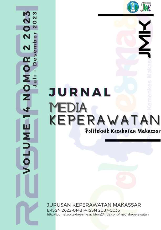 Media Keperawatan : Politeknik Kesehatan Makassar. E-ISSN 2622-0148, P-ISSN 2087-0035. Kebutuhan publikasi aspirasi ilmiah dari kalangan penggiat kesehatan khususnya Dosen dalam hal ini dosen untuk Keperawatan semakin meningkat, oleh karena itu Jurnal Media Keperawatan muncul sebagai salah satu sarana untuk publikasi segala bentuk ide, hasil penelitian serta kajian ilmiah yang berhubungan dengan pengembangan Keperawatan dan kesehatan pada umumnya. Jurnal Media Keperawatan diterbitkan oleh Jurusan Keperawatan Poltekkes Makassar dengan periode terbit 2 kali dalam setahun, yaitu terbit di bulan Juni dan Desember.