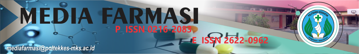 Media Farmasi Merupakan Jurnal ilmiah Kefarmasian yang diterbitkan oleh Jurusan Farmasi Poltekkes Kemenkes Makassar yang bekerja sama dengan Pengurus Daerah Ikatan Apoteker Indonesia (IAI) Makassar dan Pengurus Daerah Persatuan Ahli Farmasi Indonesia (PAFI) Makassar. Media Farmasi terbit 2 kali setahun pada bulan April dan Oktober dan telah memilki Nomor P-ISSN 0216-2083 sejak 2007 dan sejak 2018 telah memiliki Nomor E-ISSN 2622-0962 dan berdasarkan Keputusan Direktur Jenderal Pendidikan Tinggi, Riset, Dan Teknologi Kementerian Pendidikan, Kebudayaan, Riset, Dan Teknologi Nomor 230/E/KPT/2022, "Tentang Peringkat Akreditasi Jurnal Ilmiah Periode IV Tahun 2022" Maka Jurnal Media Farmasi telah Naik Peringkat dari Peringkat 5 ke Peringkat 3 mulai Volume 18 Nomor 1 Tahun 2022 sampai Volume 22 Nomor 2 Tahun 2026. Media Farmasi mulai Volume 19 No 2, Telah berpindah ke website baru dengan versi OJS 3, bagi yang ingin berkunjung ke Media Farmasi versi OJS 2 dapat melalui alamat berikut https://journal.poltekkes-mks.ac.id/ojs2/index.php/mediafarmasi/index. Jurnal yang diterbitkan oleh Media Farmasi telah melalui seleksi oleh Editor dan di review oleh para Pakar dibidangnya. Media Farmasi Mempublikasikan review article dan original article diseluruh bidang Kefarmasian seperti Farmasetika dan Teknologi Farmasi, Farmasi Klinik, Farmakognosi, Kimia Farmasi yang tidak pernah dipublikasikan di jurnal lain atau tidak dalam sementara di review oleh jurnal lain. Media Farmasi telah terindeks google scholar dan SINTA serta Pengindeks Lainnya.