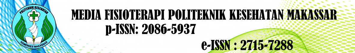 Jurnal Media Fisioterapi Poltekkes Kemenkes Makassar adalah jurnal ilmiah yang dipublikasi oleh Unit Penelitian Poltekkes Kemenkes Makassar Jurusan Fisioterapi. Jurnal Media Fisioterapi merupakan Jurnal Nasional yang diterbitkan dalam Bahasa Indonesia dan telah teregister dengan p-ISSN: 2086-5937 dan e-ISSN : 2715-7288. Jurnal Media Fisioterapi Poltekkes Kemenkes Makassar fokus pada hasil-hasil penelitian asli dan terbaru, book review dan literatur review dalam lingkup ilmu fisioterapi mencakup ilmu Fisioterapi Muskuloskeletal, Fisioterapi Neuromuskular, Fisioterapi Kardiovaskular dan Respirasi, Fisioterapi Geriatrik, Fisioterapi Pediatrik, Fisioterapi Ergonomi dan Kesehatan Kerja Fisioterapi Olahraga, dan Fisioterapi Kesehatan Masyarakat.